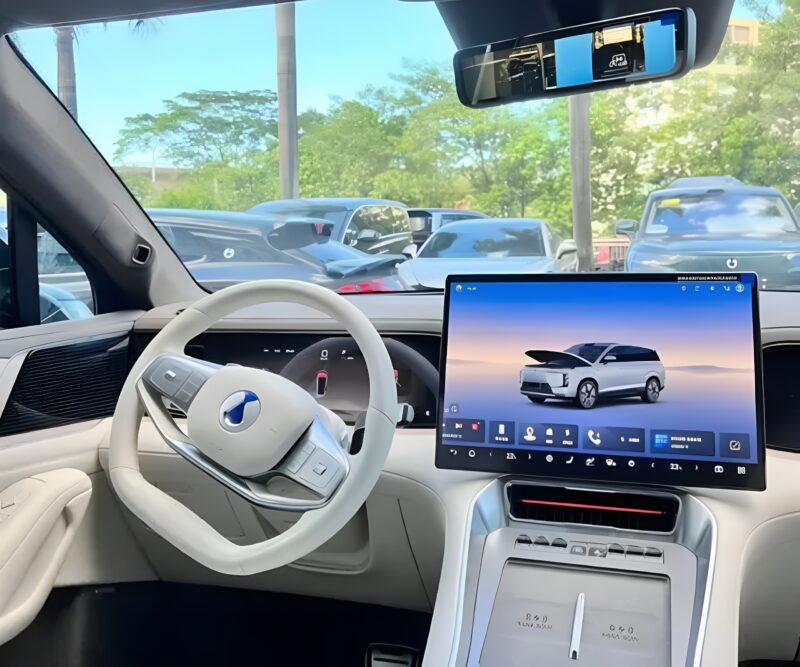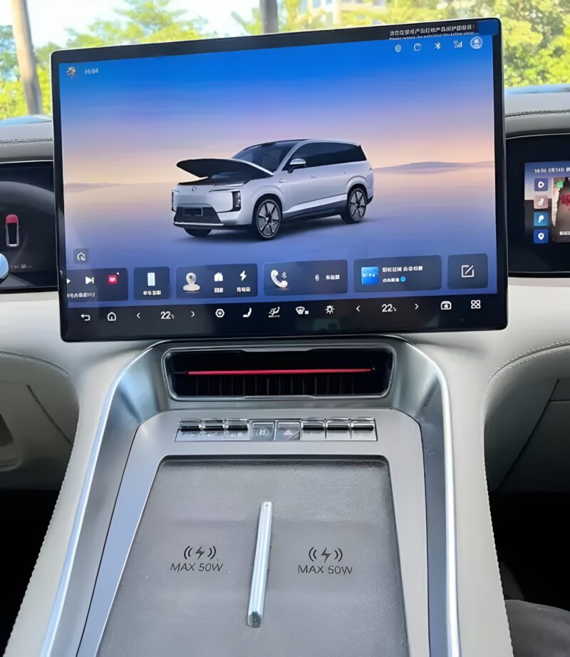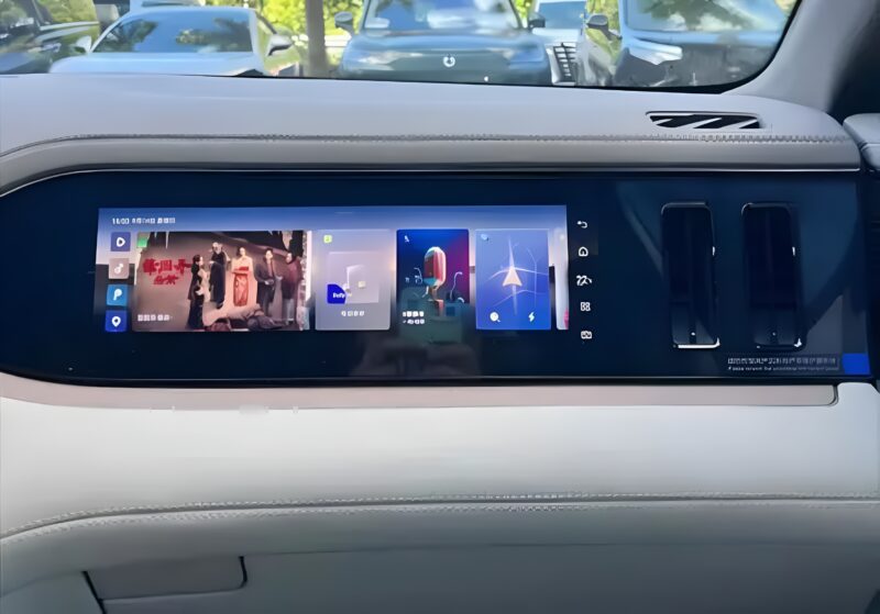แดชบอร์ดและภายในรถ แดชบอร์ดออกแบบสมมาตร มาพร้อมมาตรวัดดิจิทัลเต็มรูปแบบ หน้าจอความบันเทิงของผู้โดยสารด้านหน้า และจอทรงลอยขนาดใหญ่ตรงกลาง พวงมาลัยเป็นแบบคู่ก้าน (dual‑spoke) และคันเกียร์วางบนเสาพวงมาลัย ฟีเจอร์อื่นที่สังเกตได้คือชาร์จโทรศัพท์แบบไร้สาย ที่วางแก้วแบบมีฝาปิด และช่องเก็บของหลายจุด