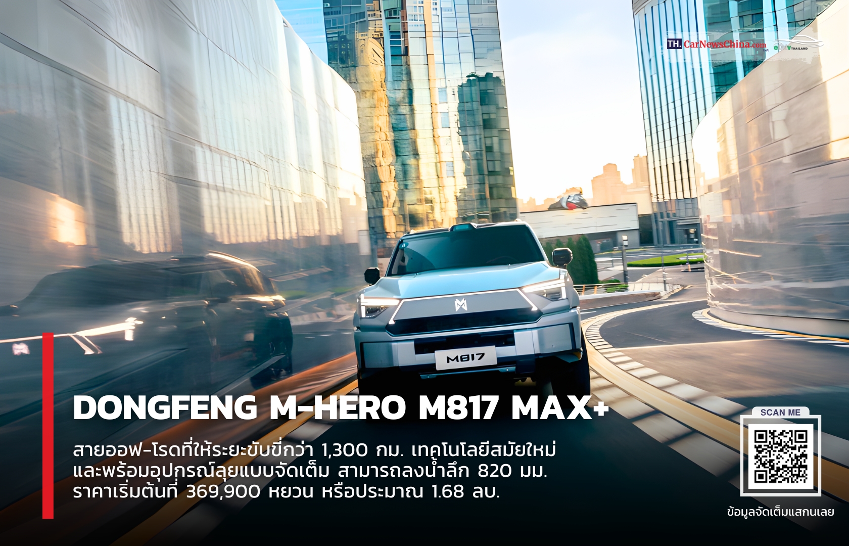 Dongfeng เปิดตัวรุ่นใหม่ในตระกูล M-Hero — M817 Max+ — มาในราคา 369,900 หยวน หรือ 1.68 ลบ. ถูกวางตำแหน่งเป็นรุ่นออฟโรดรุ่นท็อปที่เน้นทั้งความสามารถลุยและเทคโนโลยีสมัยใหม่ — มีแบตใหญ่ PHEV ระยะขับไฟฟ้า ~215 กม., ระบบช่วยขับขั้นสูง และเซ็ตอุปกรณ์สำหรับลุยน้ำ/ทางวิบากครบถ้วน