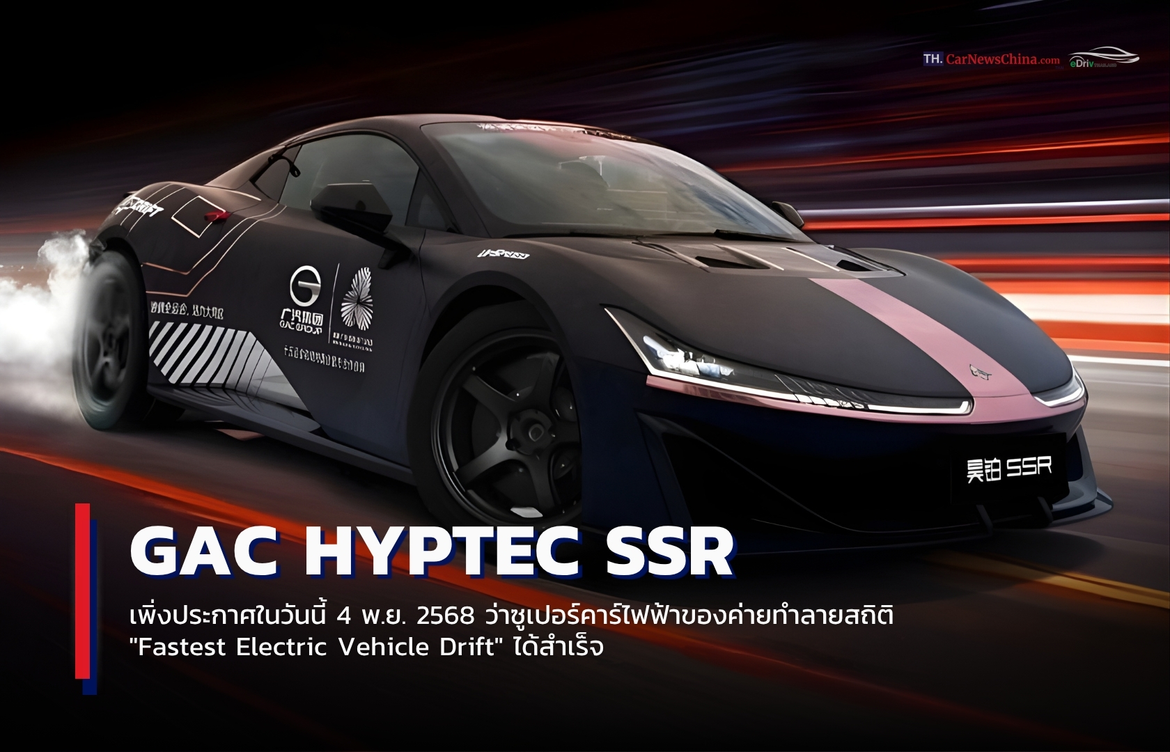 GAC Aion ประกาศข่าวใหญ่ผ่านโซเชียลมีเดียในวันที่ 4 พฤศจิกายน 2568 ว่า Hyptec SSR ซูเปอร์คาร์ไฟฟ้าของค่าย ได้สร้างสถิติโลกใหม่ของ Guinness World Record ในหมวด “Fastest Electric Vehicle Drift” ตัวเลขความเร็วที่ทำได้คือ 213.523 กิโลเมตรต่อชั่วโมง