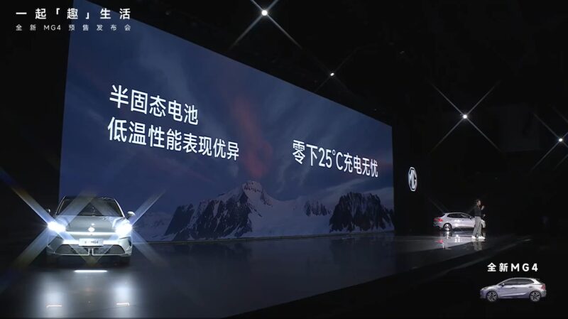 MG4 ถือเป็นหนึ่งในรถยนต์รุ่นแรกๆ ของโลกที่นำแบตเตอรี่ Semi-Solid-State มาใช้ในการผลิตเชิงพาณิชย์ SAIC รายงานว่าแบตเตอรี่ชนิดนี้ผ่านการทดสอบความปลอดภัยขั้นสูงด้วยการเจาะทะลุ (needle penetration tests) โดยไม่มีการลุกไหม้หรือเกิดควัน และยังแสดงประสิทธิภาพที่ดีขึ้นในสภาวะอุณหภูมิต่ำ นวัตกรรมนี้มีจุดมุ่งหมายเพื่อเพิ่มความปลอดภัยและยืดอายุการใช้งานของแบตเตอรี่ให้สูงขึ้น เพื่อเป็นทางเลือกใหม่ให้กับผู้บริโภคในตลาดรถยนต์ขนาดเล็ก