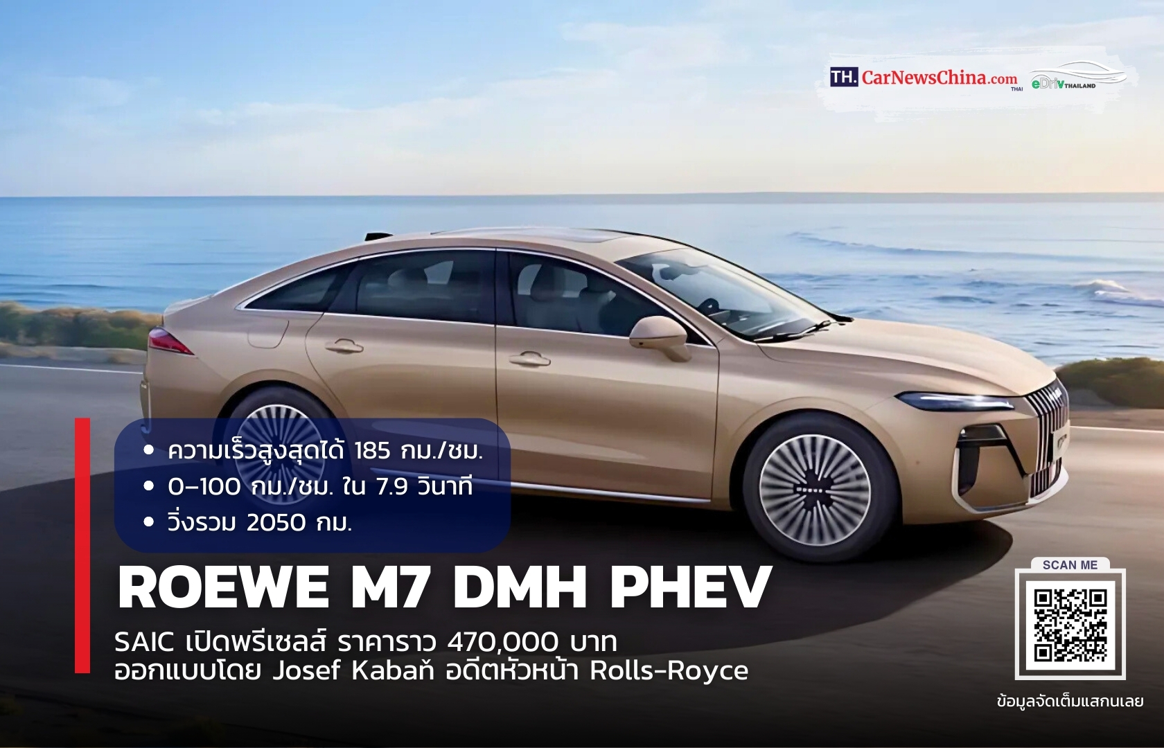 SAIC พรีเซลส์ Roewe M7 DMH ซีดานปลั๊กอินไฮบริดรุ่นเริ่มต้นระยะทางไกล มีให้เลือก 3 รุ่นย่อย ราคา 97,800–114,800 หยวน (ประมาณ 470,000–550,000 บาท) นับเป็นรถรุ่นแรกที่ออกแบบโดย Josef Kabaň อดีตหัวหน้าฝ่ายดีไซน์ของ Rolls-Royce มอบระยะทางวิ่งรวมสูงสุด 2,050 กม. (มาตรฐาน CLTC) และวิ่งไฟฟ้าล้วนได้ 160 กม.